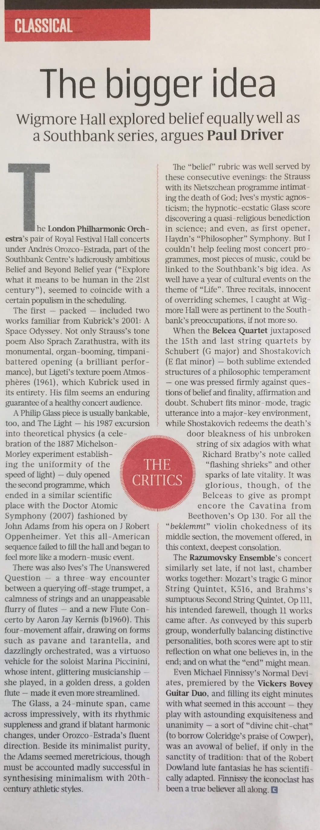 ‘Ryan Probert’s 36 Views of Mt Fuji (of which we heard 10 or so) were more charmingly Satie-like in their oddity, and played with truly uncanny unanimity by guitarists Julian Vickers and Daniel Bovey’. Ivan Hewett, See the full review here.